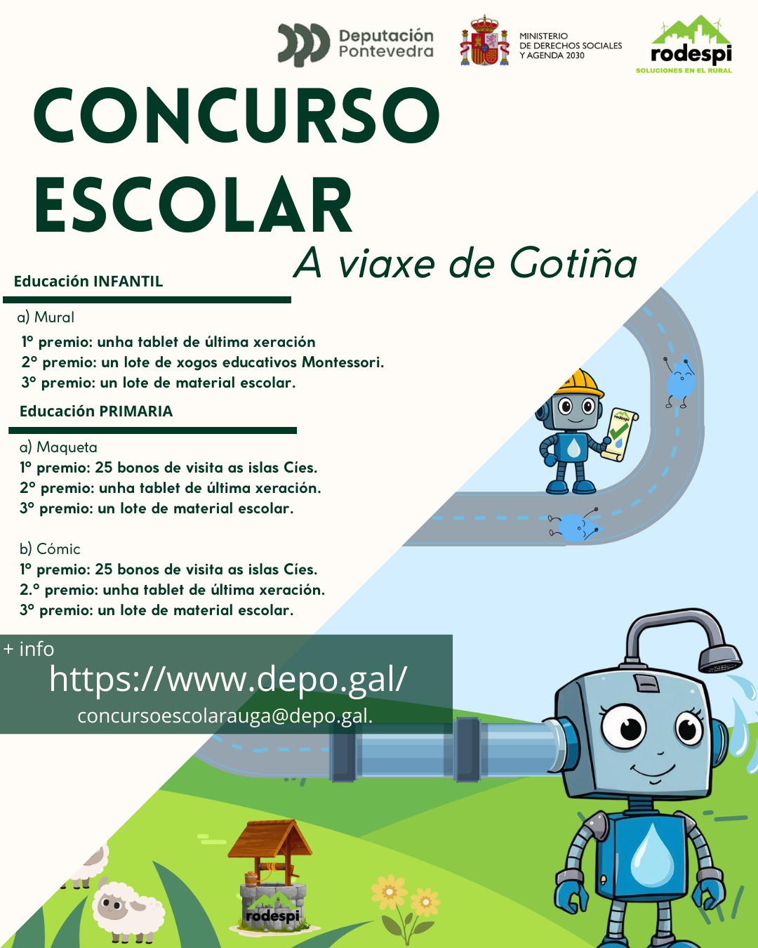 A Deputación de Pontevedra, coa colaboración coa entidade experta en xestión de augas do rural, Rodespi, lanza o concurso escolar do ano 2026: ✨ A Viaxe de Gotiña ✨💧
